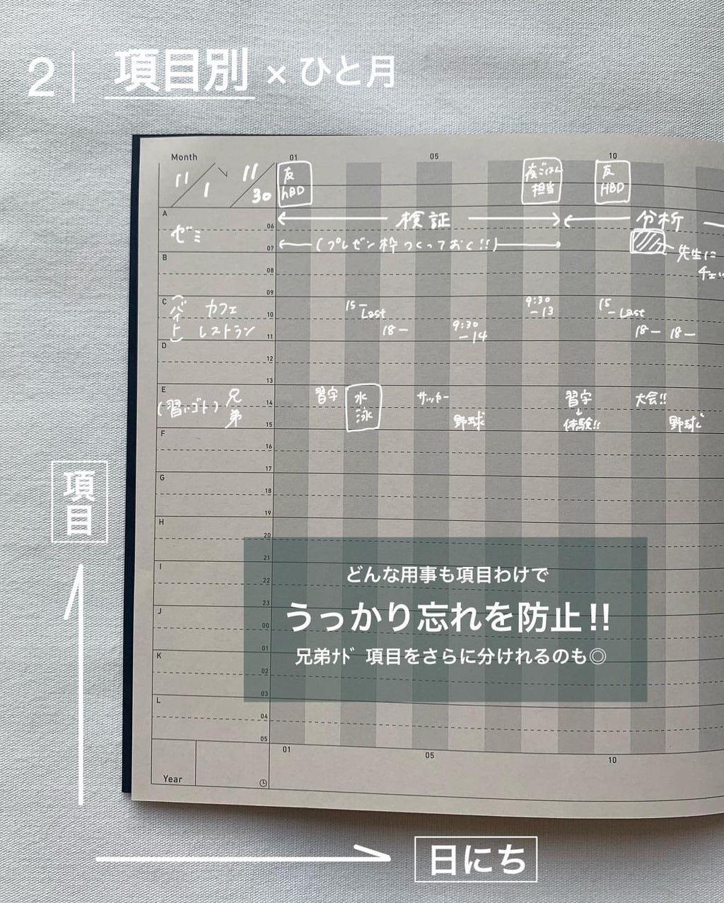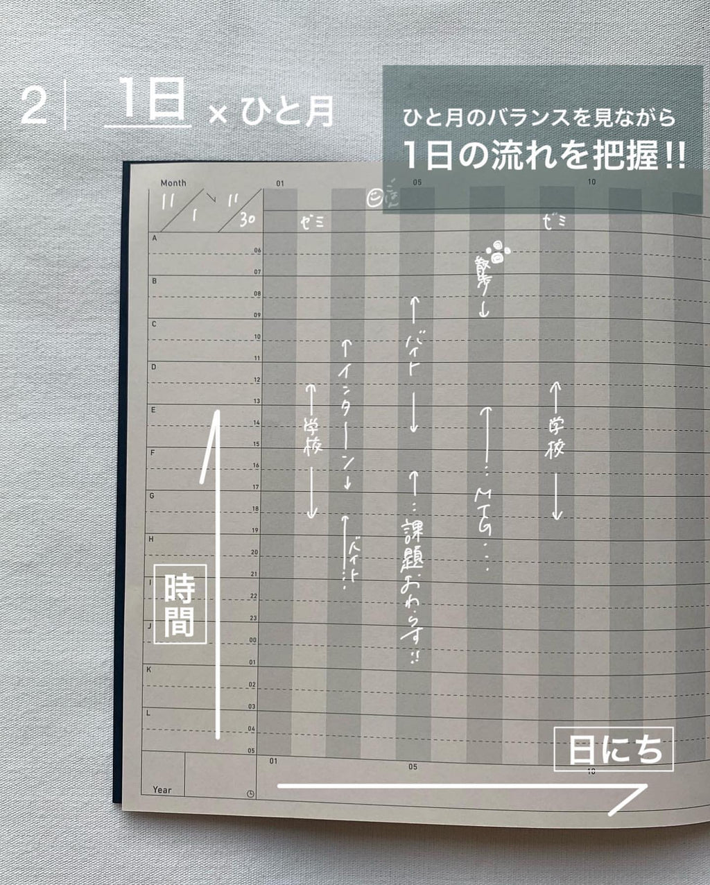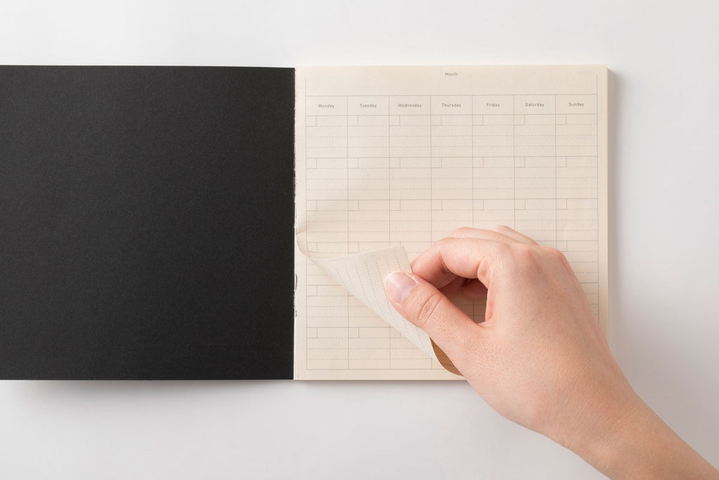 This is a notebook that you can use as you wish, including a calendar where you can write freely and a Gantt chart that can be used vertically and horizontally. This unique design was created through repeated research on how to use the vertical and horizontal axes of a Gantt chart.